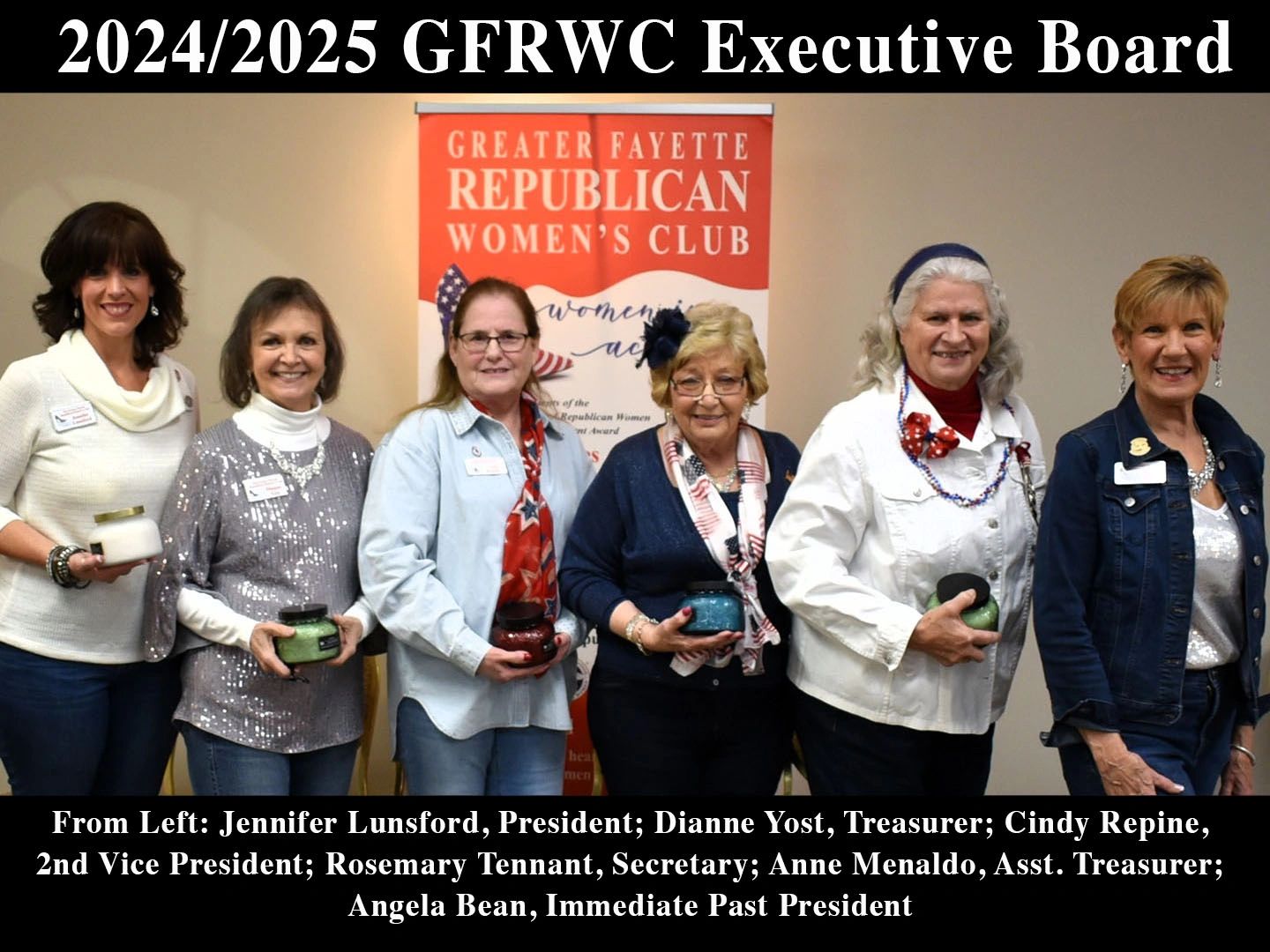 It is my honor to be elected as the Greater Fayette Republican Women's Club President for 2024-2025. As a member of this incredible organization for four years, I have seen us grow as a membership, work over 4,000 volunteer hours in 2023, and win recognition awards for the work we have done to educate our community about Republican values, the Republican mission, and Republican platforms. Additionally, and maybe most importantly, I have learned how voting for the Republican candidates on election day is not what being a Republican is. It is bigger than voting. It is about supporting what we want our Republican elected officials to represent and support while creating the laws we must follow. It is about understanding WHY we vote for the Republican Party. Without the GFRWC, I would not be an educated voter at the polls and I do believe we should be educated on what is at stake for the future of America.